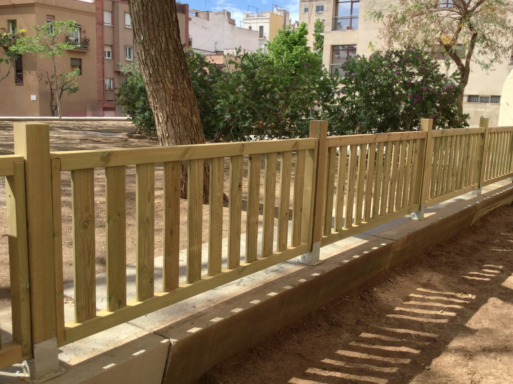 Fusta de pi de Flandes tractada a l’autoclau nivell IV. La impregnació es realitza mitjançant el sistema Bethel buit-pressió a base de sals hidrosolubles lliures de crom i arsènic.