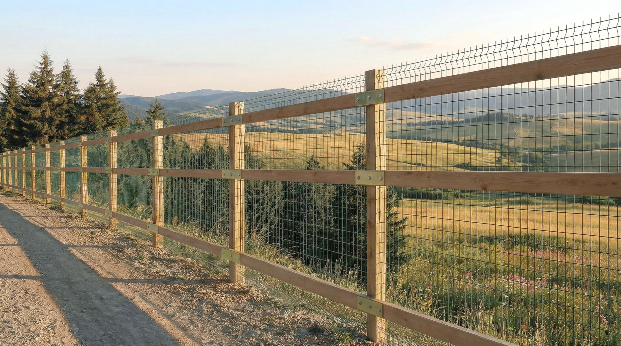 Fusta de pi, reixa electrosoldada i ancoratges metàl·lics.