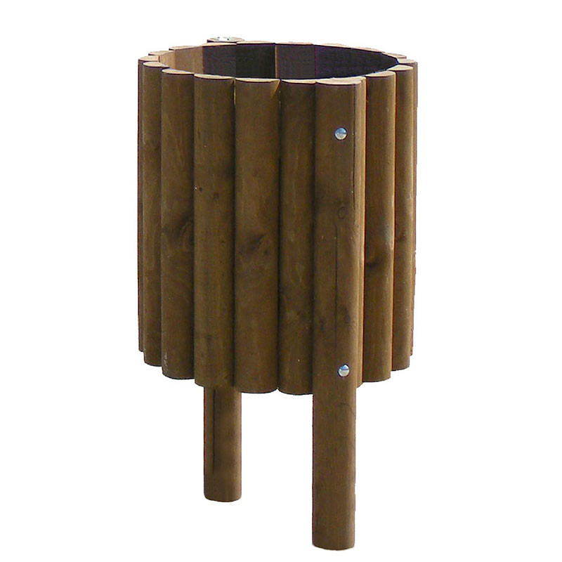 La papelera Calera es de madera de pino silvestre tratada en autoclave nivel IV con palos redondos cortados a media caña. Dispone de un aro interior para la sujeción de la bolsa de basura. Estructura interior y soporte para la bolsa galvanizados en frío y pletinas galvanizadas en caliente por sistema de inmersión. Capacidad del depósito: 90 l.